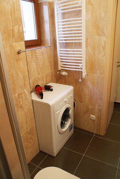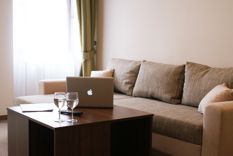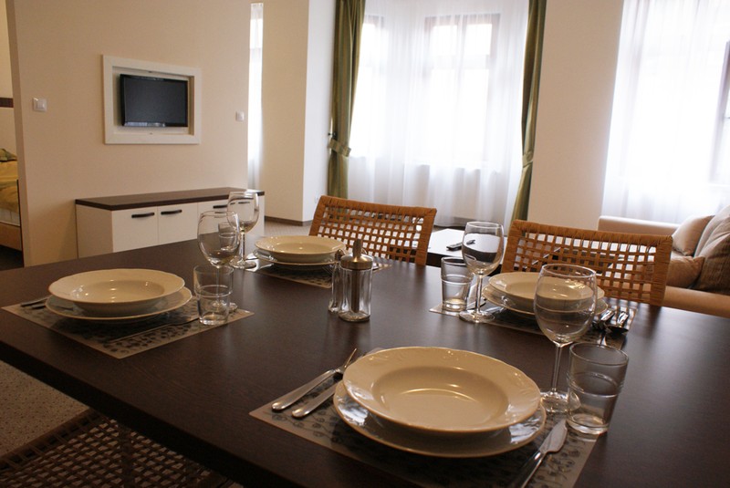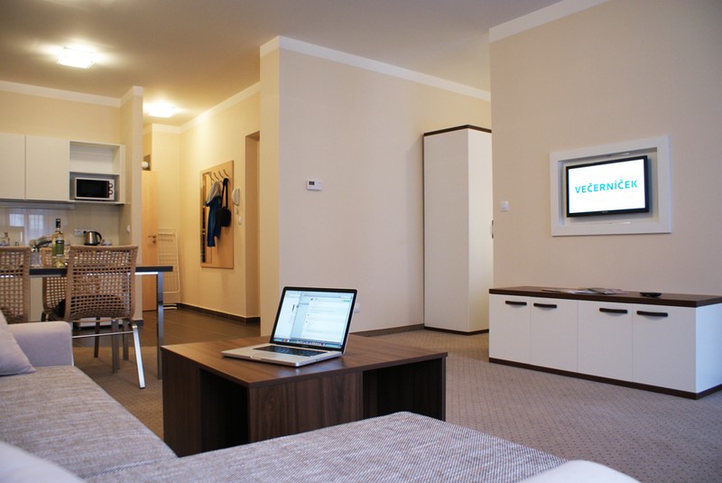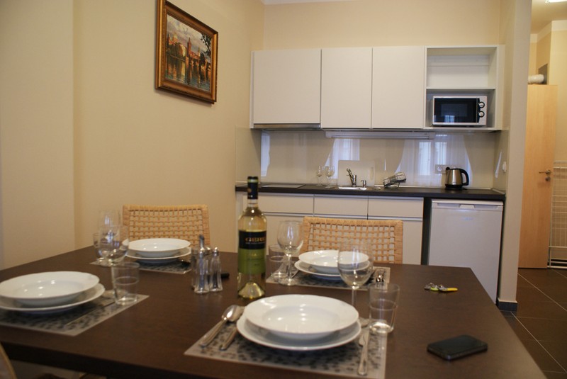 В каждом апартаменте: кухня (плиточное покрытие, пол подогревается), холодильник, микроволновая печь, электрочайник, плита, вся необходимая посуда, обеденный стол, стулья, гостиная + спальня (ковровое покрытие), диван (раскладывающийся), двуспальная кровать, прикроватные тумбы, комод, шкаф, сейф, гладильные принадлежности, сушилка для белья, телевизор HD, российские каналы (спутник), ванная комната, душ, фен, стиральная машина, бесплатный Wi-Fi интернет