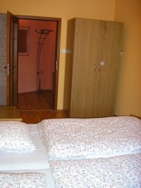 В одной комнате двухспальная кровать, две тумбочки и платяной шкаф.