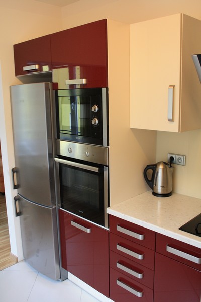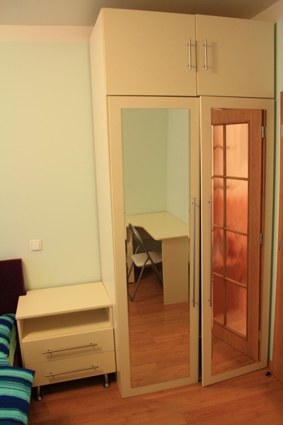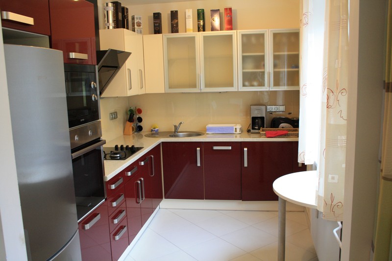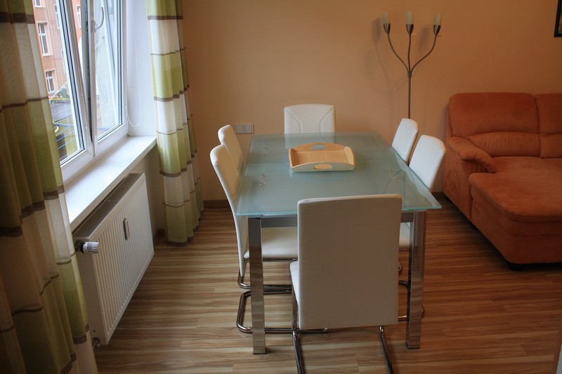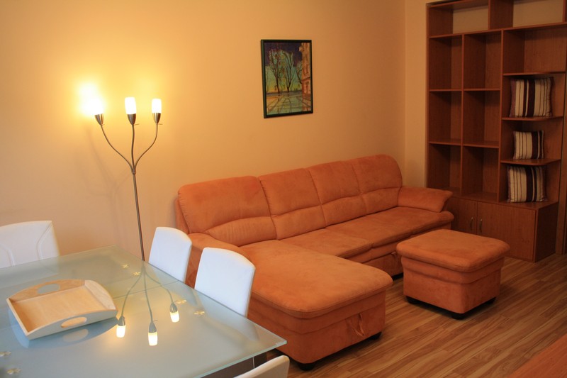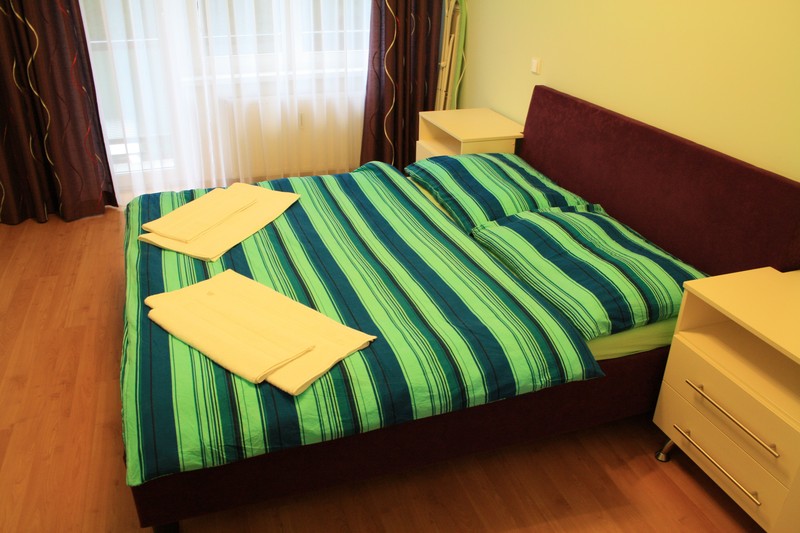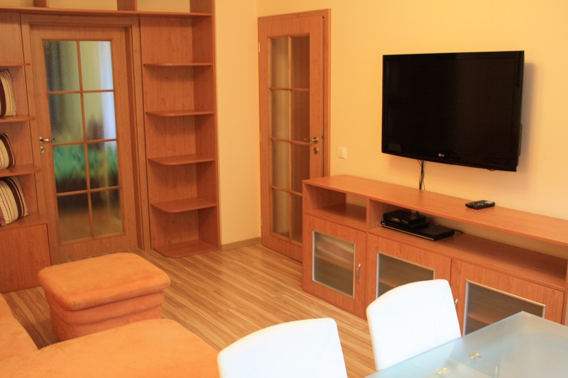 Апартамент состоит из двух комнат с кухней, прихожей, ванной и туалетом. Кухня оборудована всем необходимым для приготовления пищи (посудомоечная и стиральная машина, кофеварка, бытовая техника). Ванная комната с душем, туалетом, феном + отдельный туалет. В спальне: двуспальная кровать, шкаф,тумбочки, угловой столик, телефизор. В гостиной: обеденный стол, угловой раскладывающийся двуспальный диван, телевизор. Есть балкон.