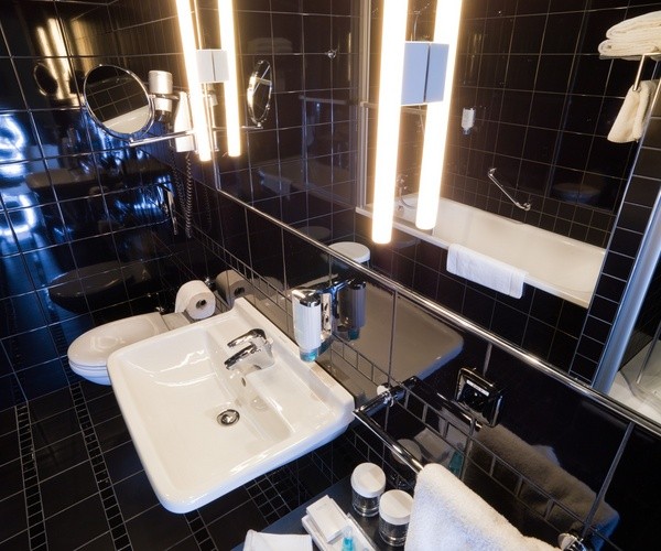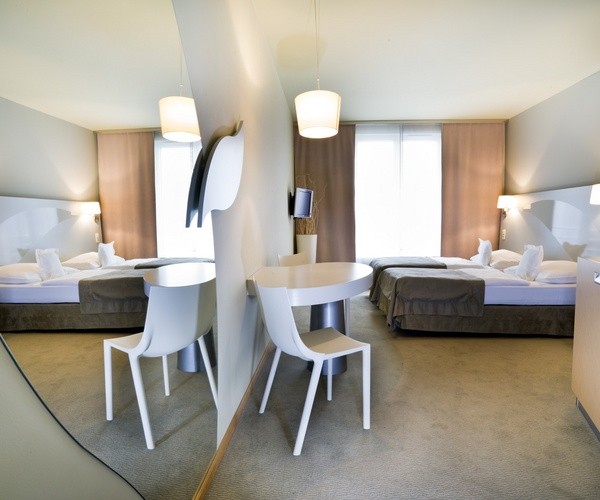 Одна двуспальная кровать или две односпальные кровати. Примерная площадь 17-20 м2. Черно-белая ванная комната с феном для волос, душем или ванной. Возможно добавить дополнительную кровать (детскую кровать) для третьего человека.
